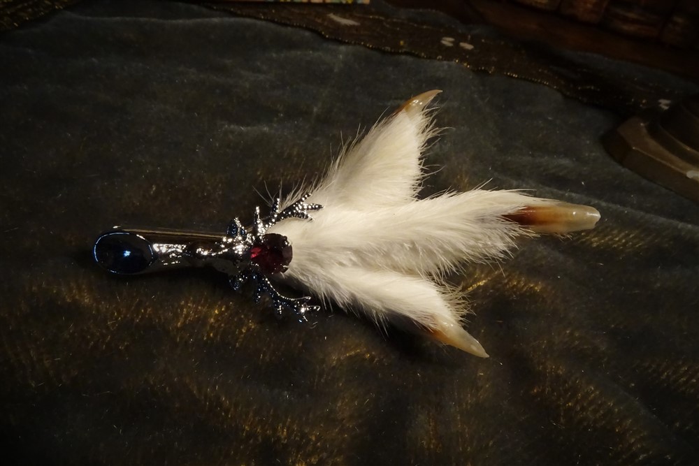 In contract to the Victorian Pin, above is a pin from the late 20th century. It has a pretty appearance with white fluffy feathers. Even on the reverse, the scaly features are covered with feathers. These don’t look macabre (unless of course, you have a bird phobia!). The setting on this piece is very bright silver metal, probably chrome, and it has a purple glass stone. The setting is much cheaper and you can see that less crafsmanship has been used compared to the earlier piece. This was made to be sold as a brooch rather than a kilt pin.