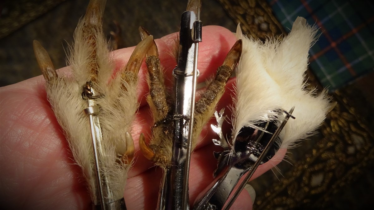 In more recent years, as in the photo above, grouse claw kilt pins are sold as brooches (Braisd Spog Circe-Fraioch). They are now souvenirs from The Highlands and have have a white fluffy appearance and are very feminine. But originally their appearance was much different, you might say, a little macabre.